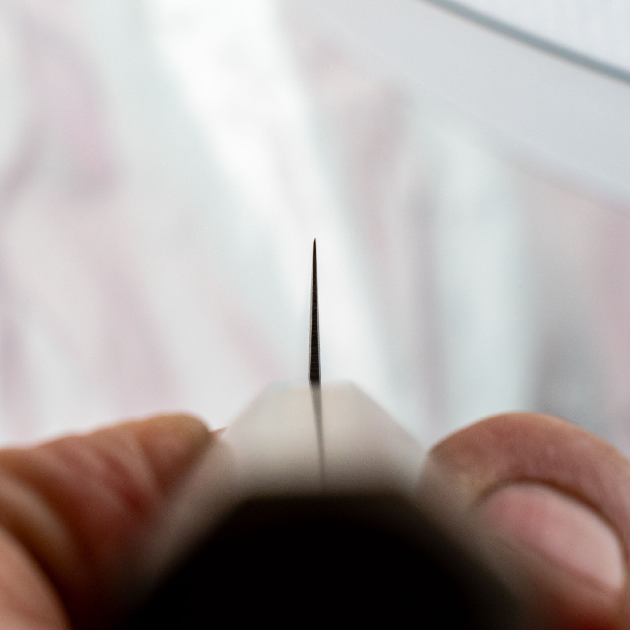 Vær opmærksom på hvor hårdt kniven er hærdet. Vær især påpasselig med knive på 60 hrc og derover. Hårde fødevarer kan ”chippe” klingen. Pas på med frugtsten, knogler, skaldyr, træagtige stængler eller meget hård ost. Frosne fødevarer er totalt no-go.