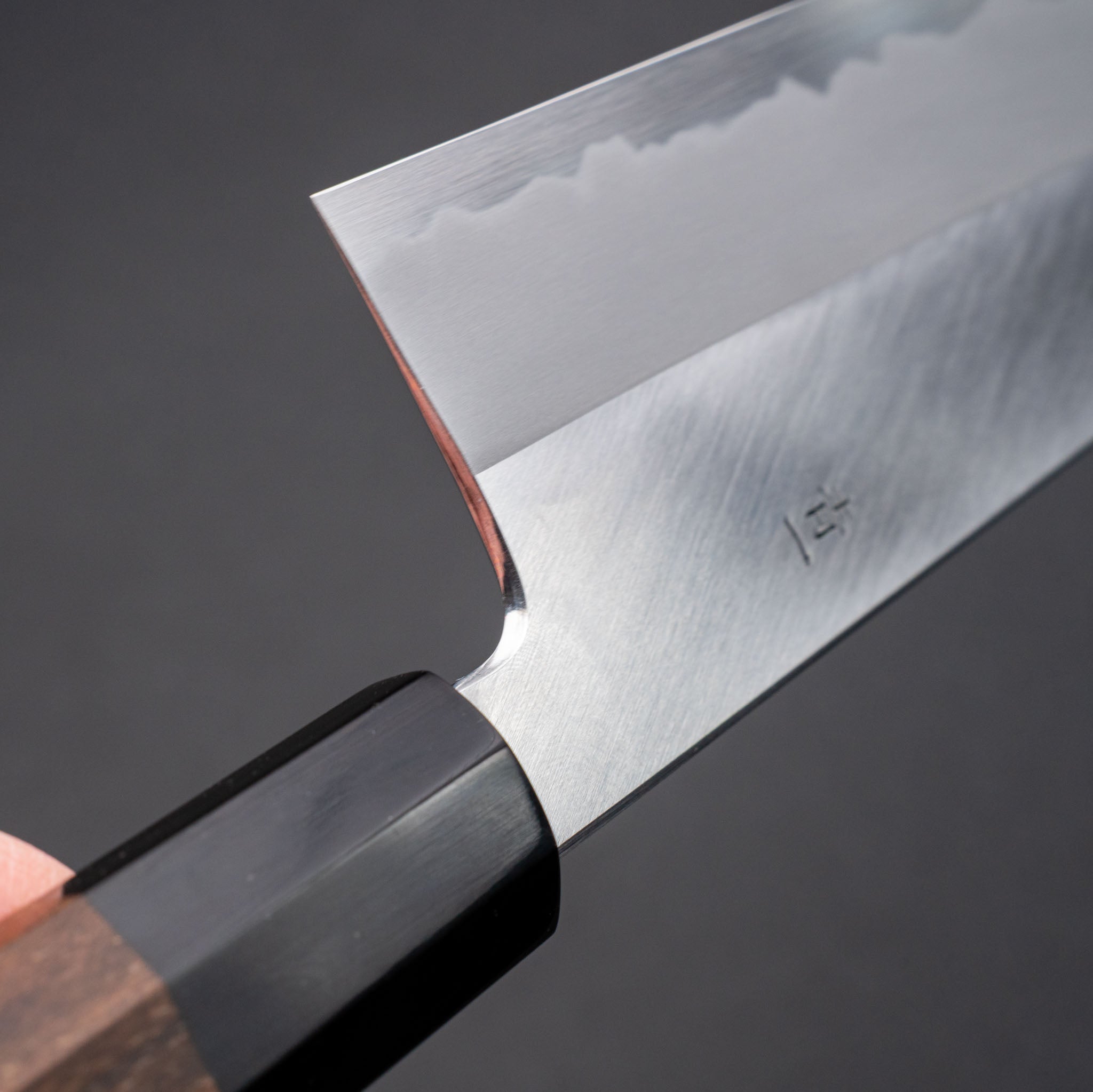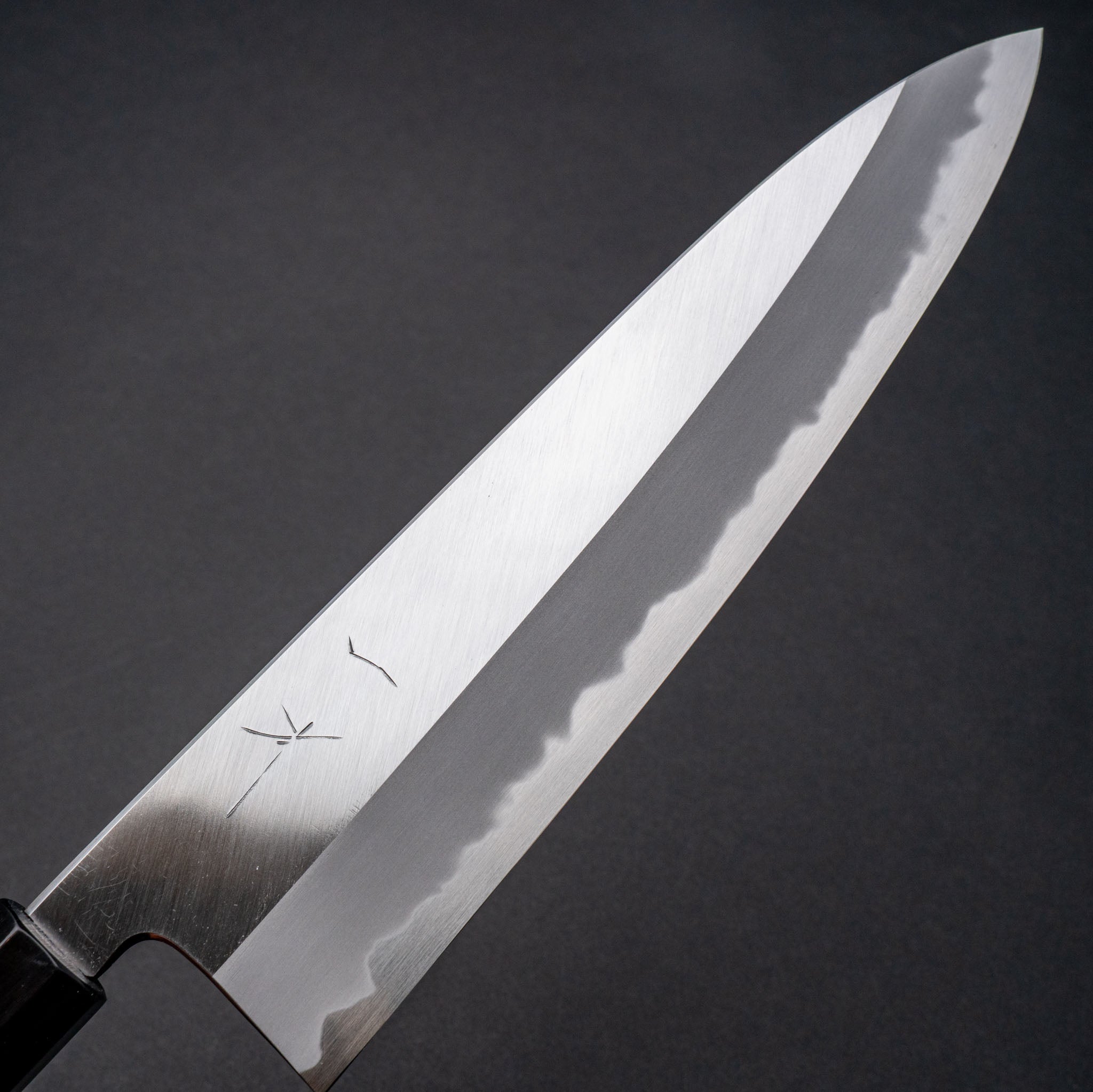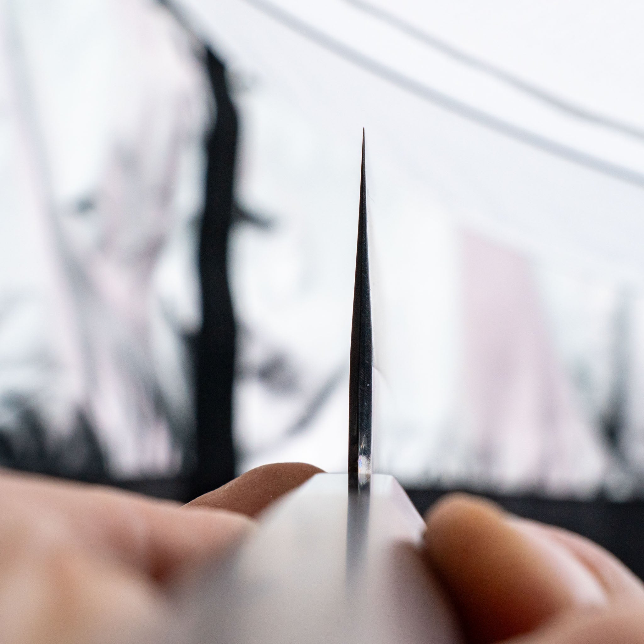 Kyuzo’s father Heihachi is one of the busiest sharpeners in Sakai. Heihachi’s workshop room and corridor were always filled with knives waiting to be sharpened. Although Kyuzo initially worked under his father to learn the foundation of rough sharpening, eventually he became a student of Kambei, known as one of the best sharpeners in Sakai because he knew best how to sharpen wide double bevel knives. After a few years of training, he built his style based on both his father and Kambei’s respective styles. Today, Kyuzo is one of only a few people who can sharpen wide double bevel with really good Shinogi-line in Sakai, one of the most challenging techniques in sharpening.