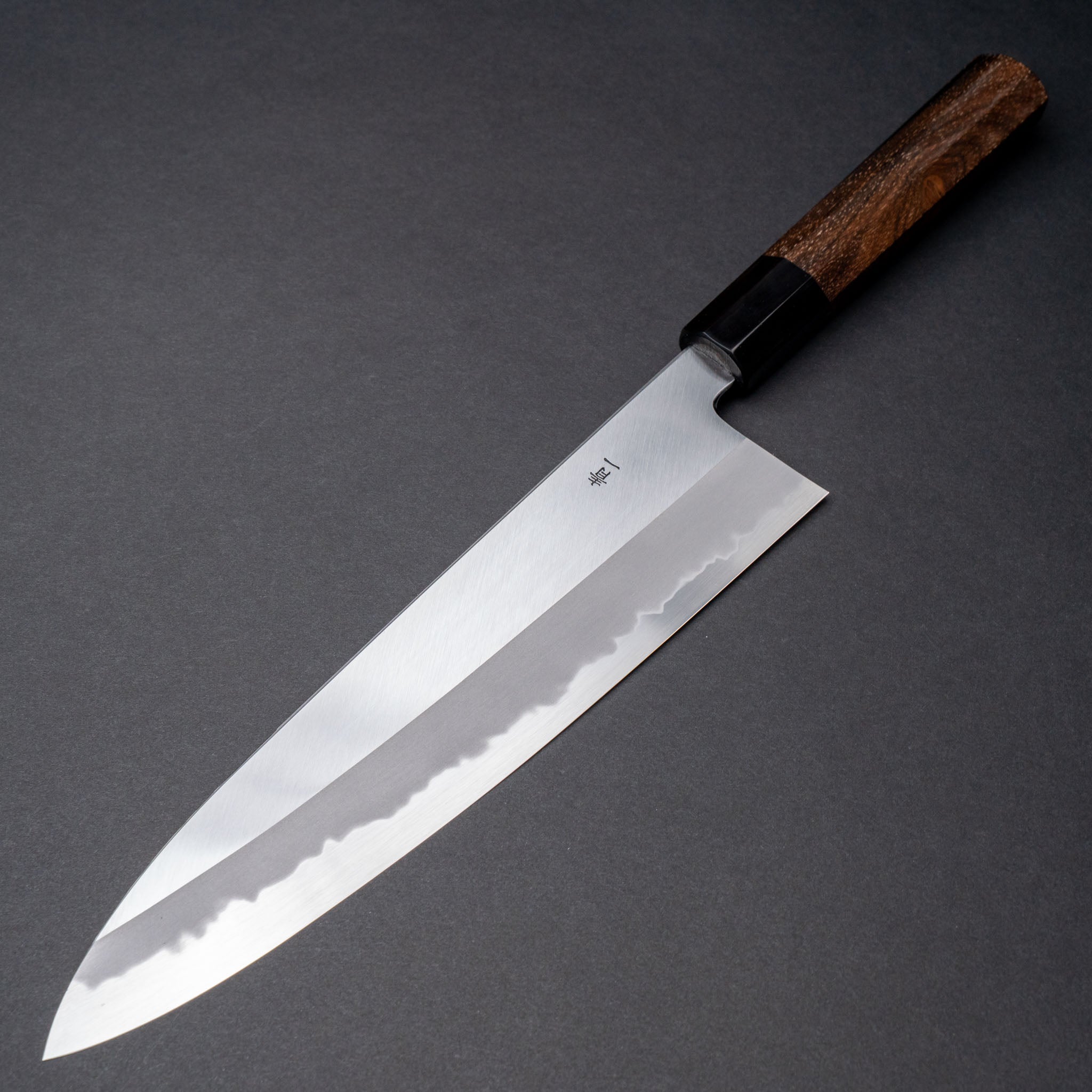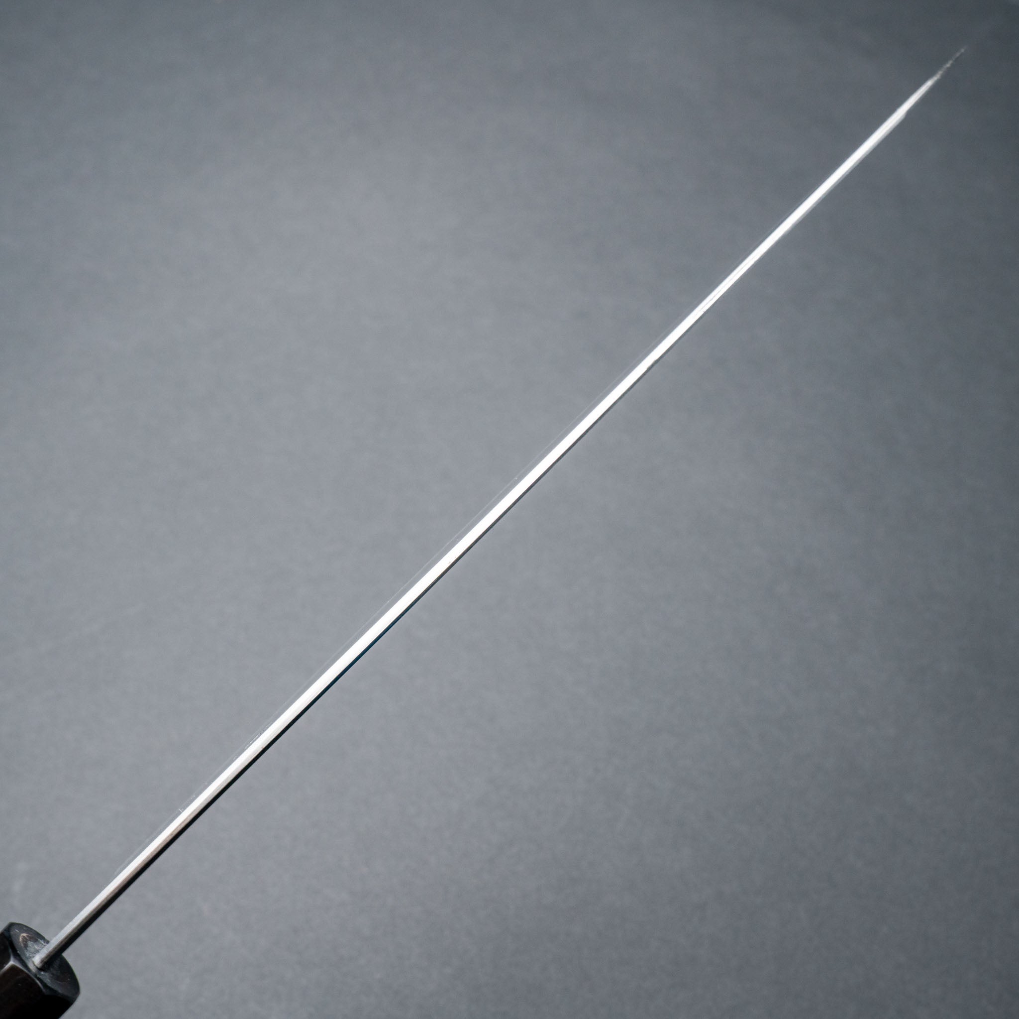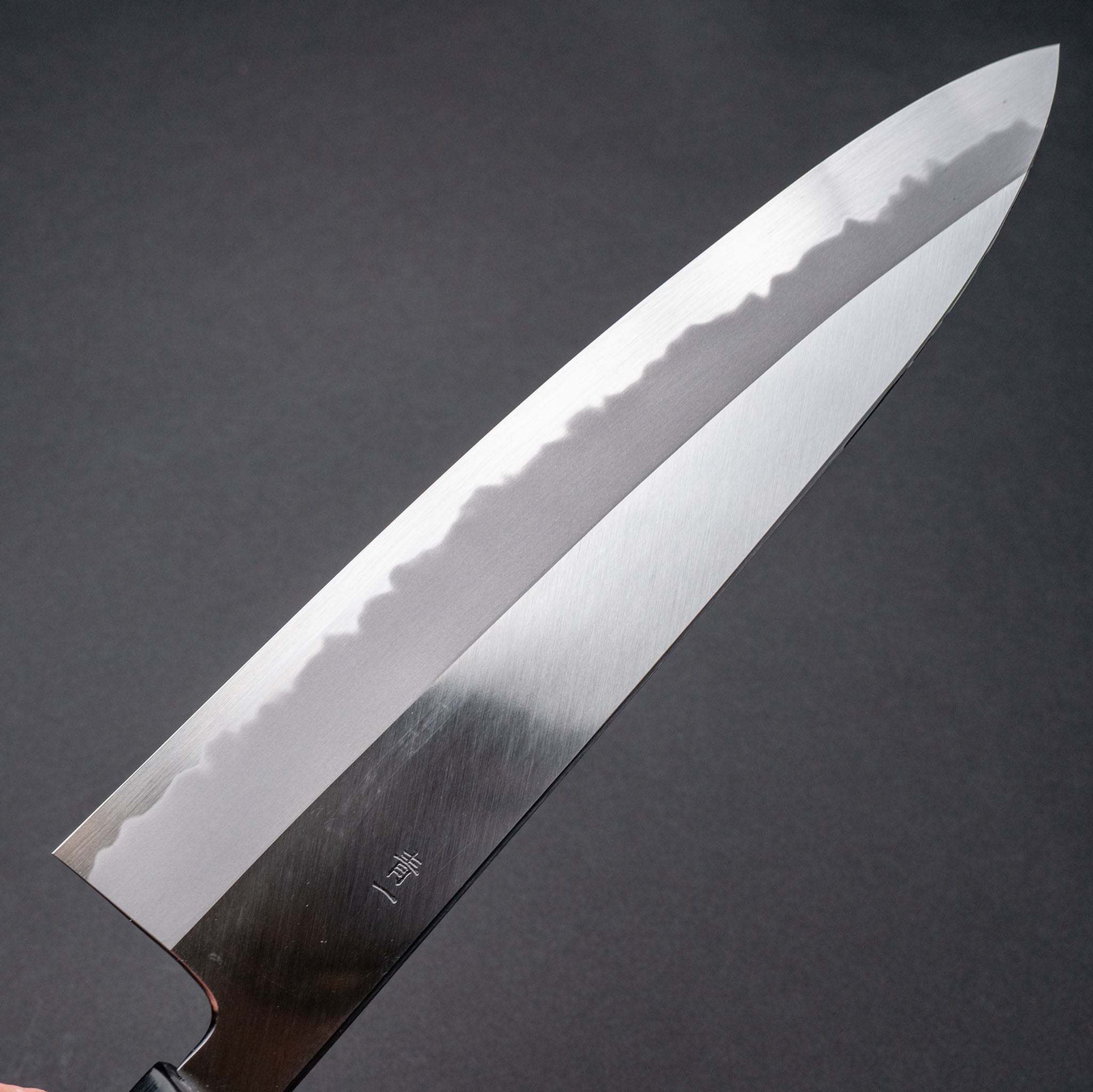 Kyuzo’s father Heihachi is one of the busiest sharpeners in Sakai. Heihachi’s workshop room and corridor were always filled with knives waiting to be sharpened. Although Kyuzo initially worked under his father to learn the foundation of rough sharpening, eventually he became a student of Kambei, known as one of the best sharpeners in Sakai because he knew best how to sharpen wide double bevel knives. After a few years of training, he built his style based on both his father and Kambei’s respective styles. Today, Kyuzo is one of only a few people who can sharpen wide double bevel with really good Shinogi-line in Sakai, one of the most challenging techniques in sharpening.