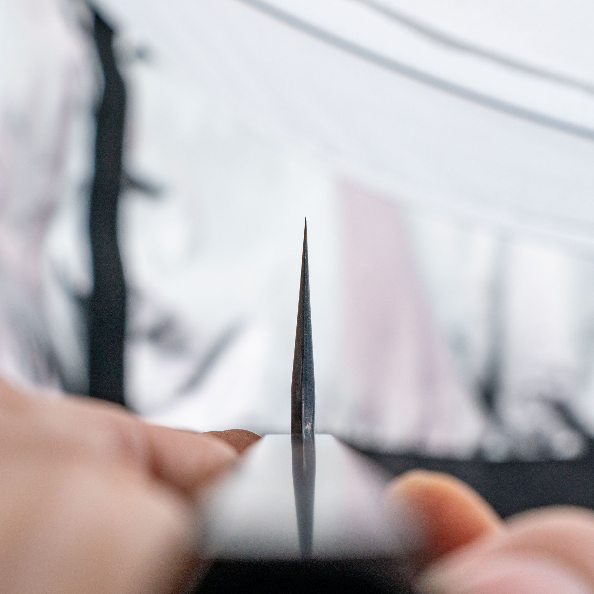 Kyuzo’s father Heihachi is one of the busiest sharpeners in Sakai. Heihachi’s workshop room and corridor were always filled with knives waiting to be sharpened. Although Kyuzo initially worked under his father to learn the foundation of rough sharpening, eventually he became a student of Kambei, known as one of the best sharpeners in Sakai because he knew best how to sharpen wide double bevel knives. After a few years of training, he built his style based on both his father and Kambei’s respective styles. Today, Kyuzo is one of only a few people who can sharpen wide double bevel with really good Shinogi-line in Sakai, one of the most challenging techniques in sharpening.