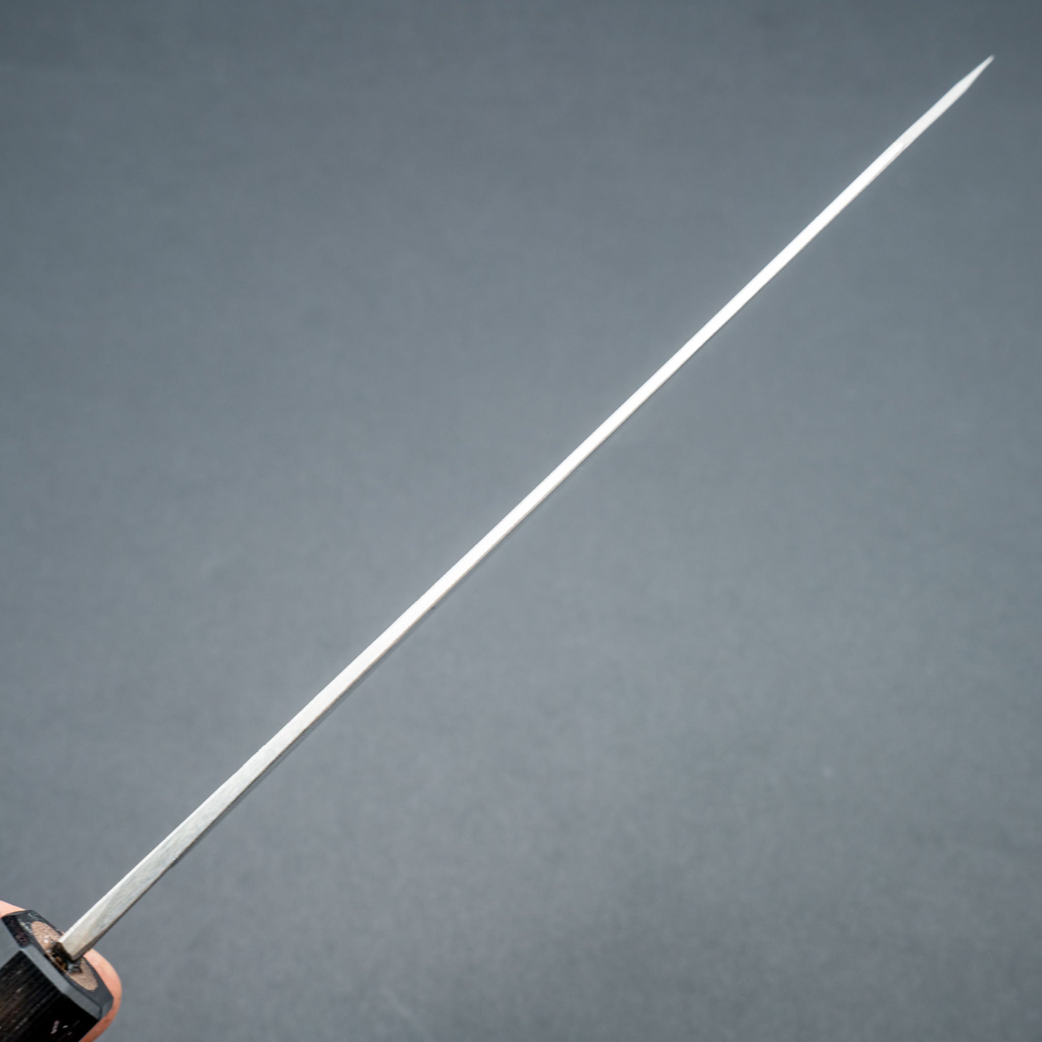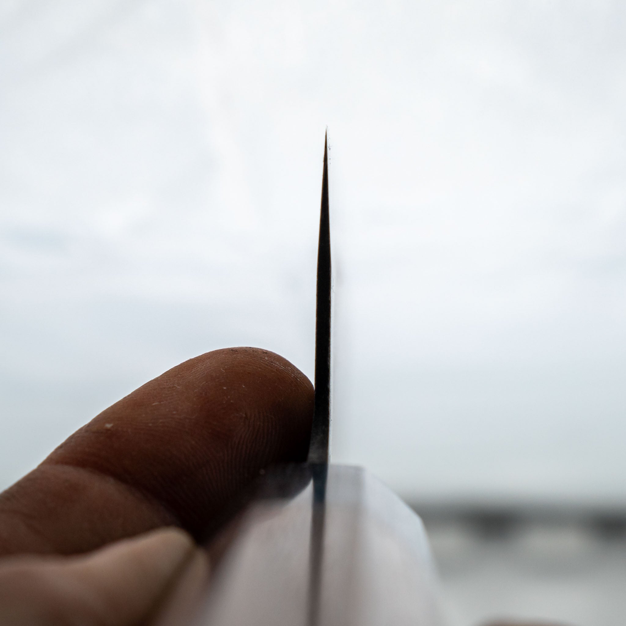 Kniven er bygget op med en hård kerne af Aogami #1, omsluttet af et blødt lag rustfrit stål på hver side.