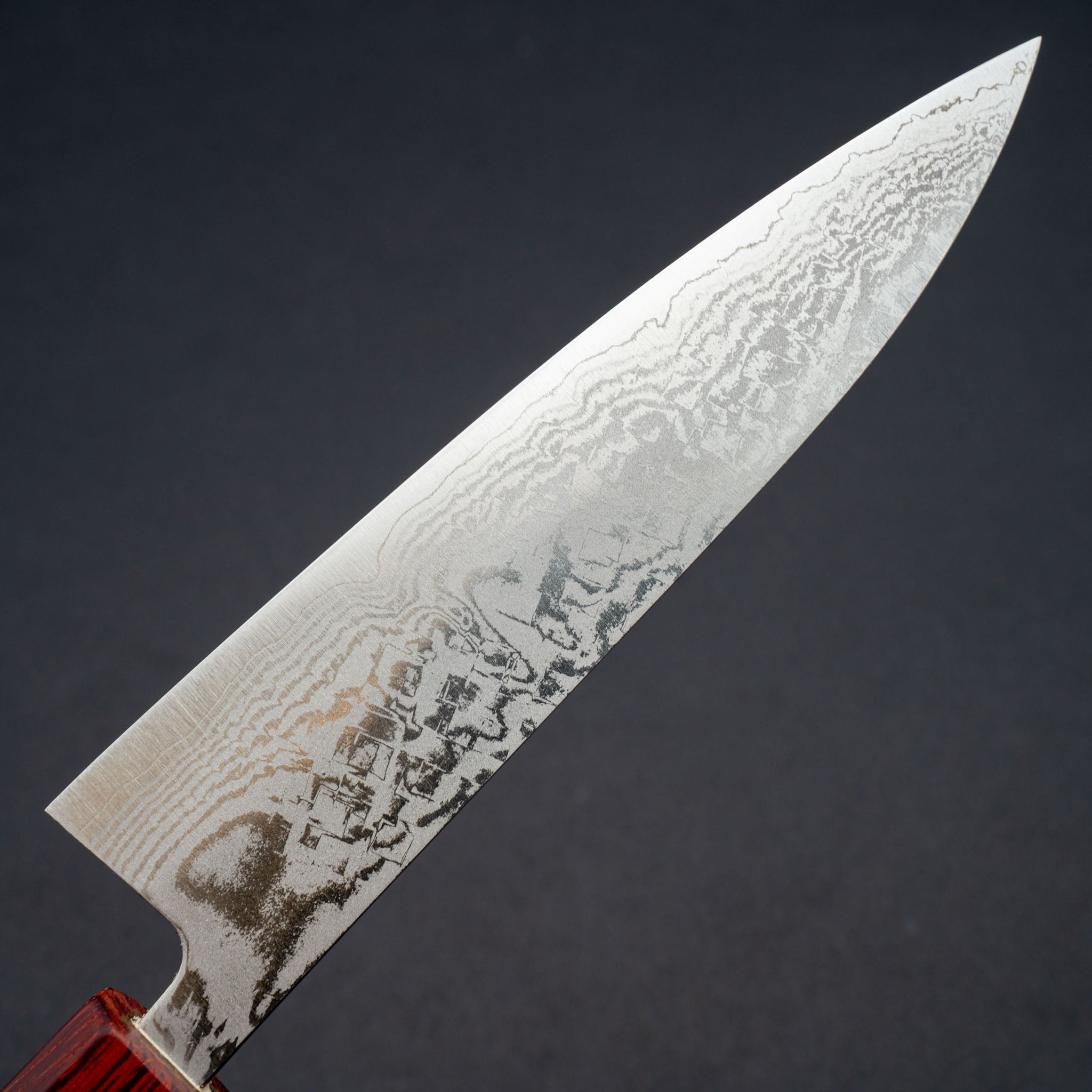 Håndsmedet VG10 kernestål, hvilket man ikke ser så ofte. Det udmærker sig med en skarphed, robusthed og en ”toothiness” i æggen som er ud over det sædvanlige.
