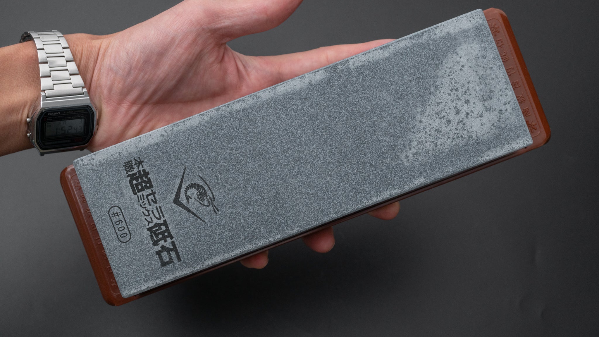 Stenen er monteret på base/holder og der medfølger en nagura som bruges til at frembringe slurry og afretning.